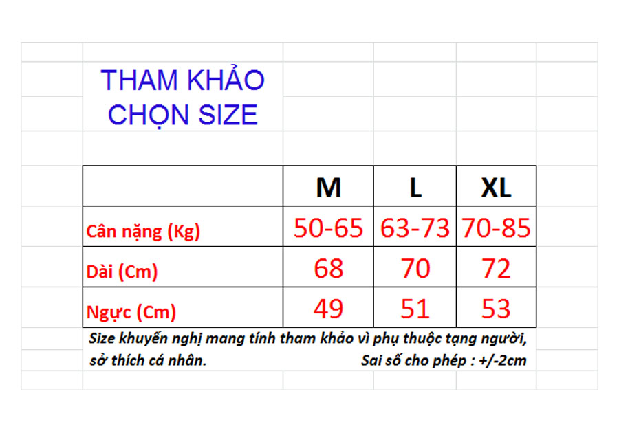 Size khuyến nghị chỉ mang tính tương đối để tham khảo vì còn phụ thuộc chiều cao, tạng người, sở thích cá nhân mặc ôm, vừa hay rộng. Nhắn tin cho shop nếu cần tư vấn size nhé.