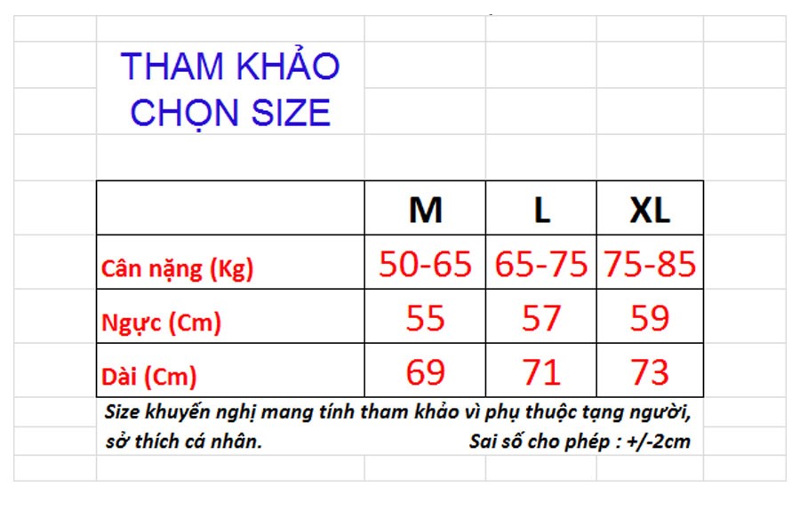 Size khuyến nghị chỉ mang tính tương đối để tham khảo vì còn phụ thuộc chiều cao, tạng người, sở thích cá nhân mặc ôm, vừa hay rộng. Nhắn tin cho shop nếu cần tư vấn size nhé.