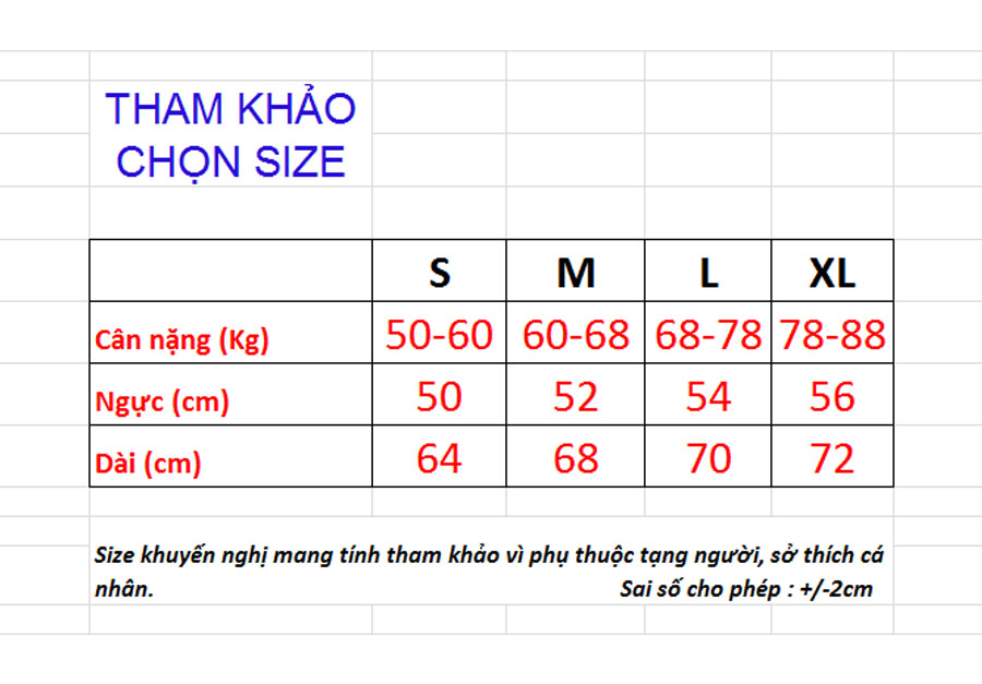Size khuyến nghị chỉ mang tính tương đối để tham khảo vì còn phụ thuộc chiều cao, tạng người, sở thích cá nhân mặc ôm, vừa hay rộng. Nhắn tin cho shop nếu cần tư vấn size nhé.