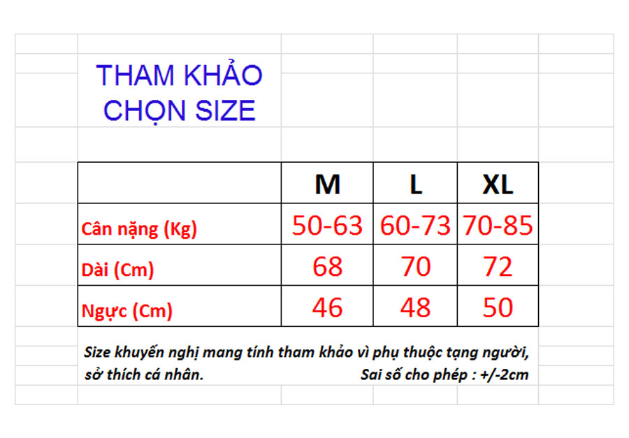 Size khuyến nghị chỉ mang tính tương đối để tham khảo vì còn phụ thuộc chiều cao, tạng người, sở thích cá nhân mặc ôm, vừa hay rộng. Nhắn tin cho shop nếu cần tư vấn size nhé.