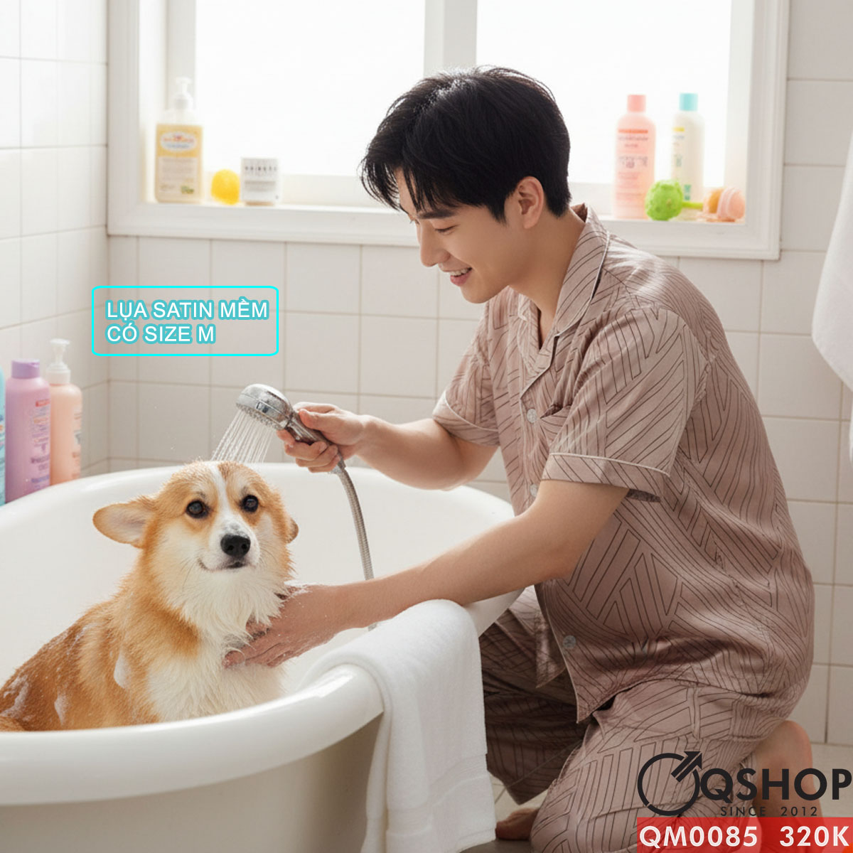 Bộ đồ ngủ pijama nam lụa satin quần dài tay ngắn mặc nhà mặc ngủ thoải mái QM0085