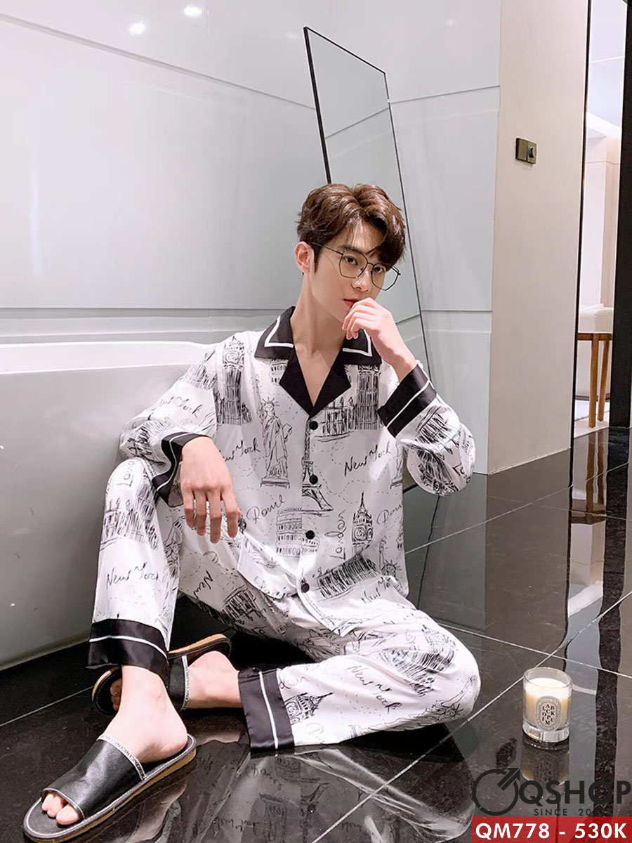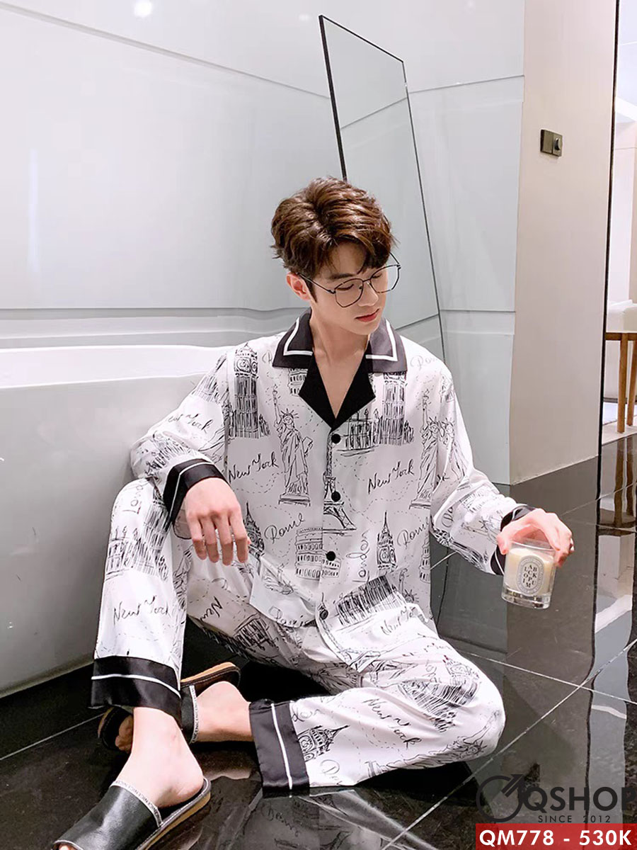 Bộ đồ pijama nam tay dài lụa luxury cao cấp mặc nhà mặc ngủ thoải mái QM778