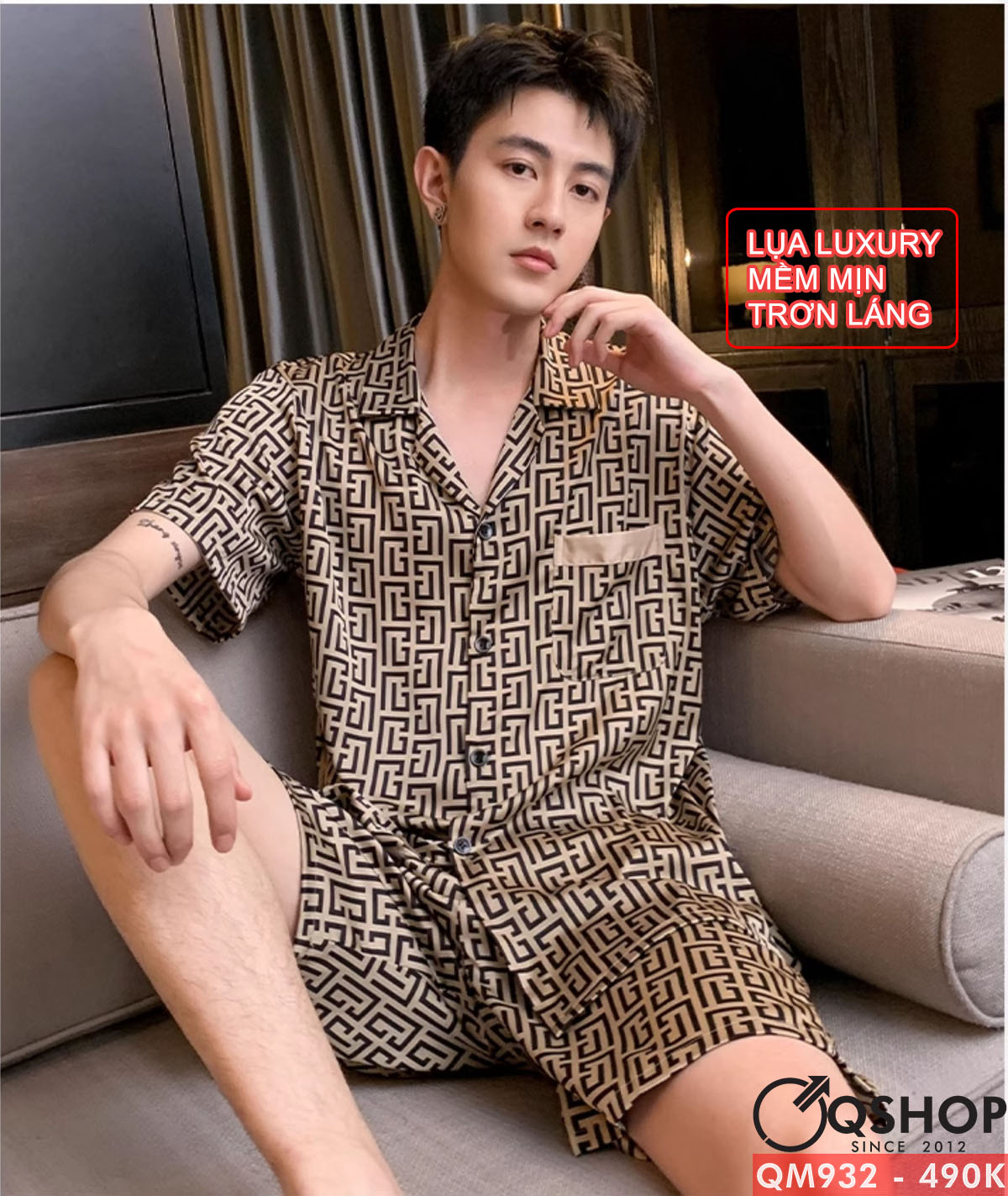 Bộ pijama nam quần ngắn có 2 túi lụa Luxury mềm mịn trơn láng mặc ngủ thoải mái QM932