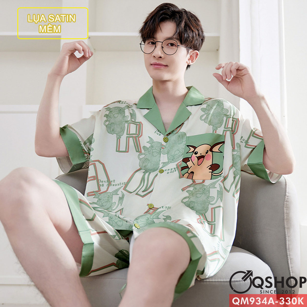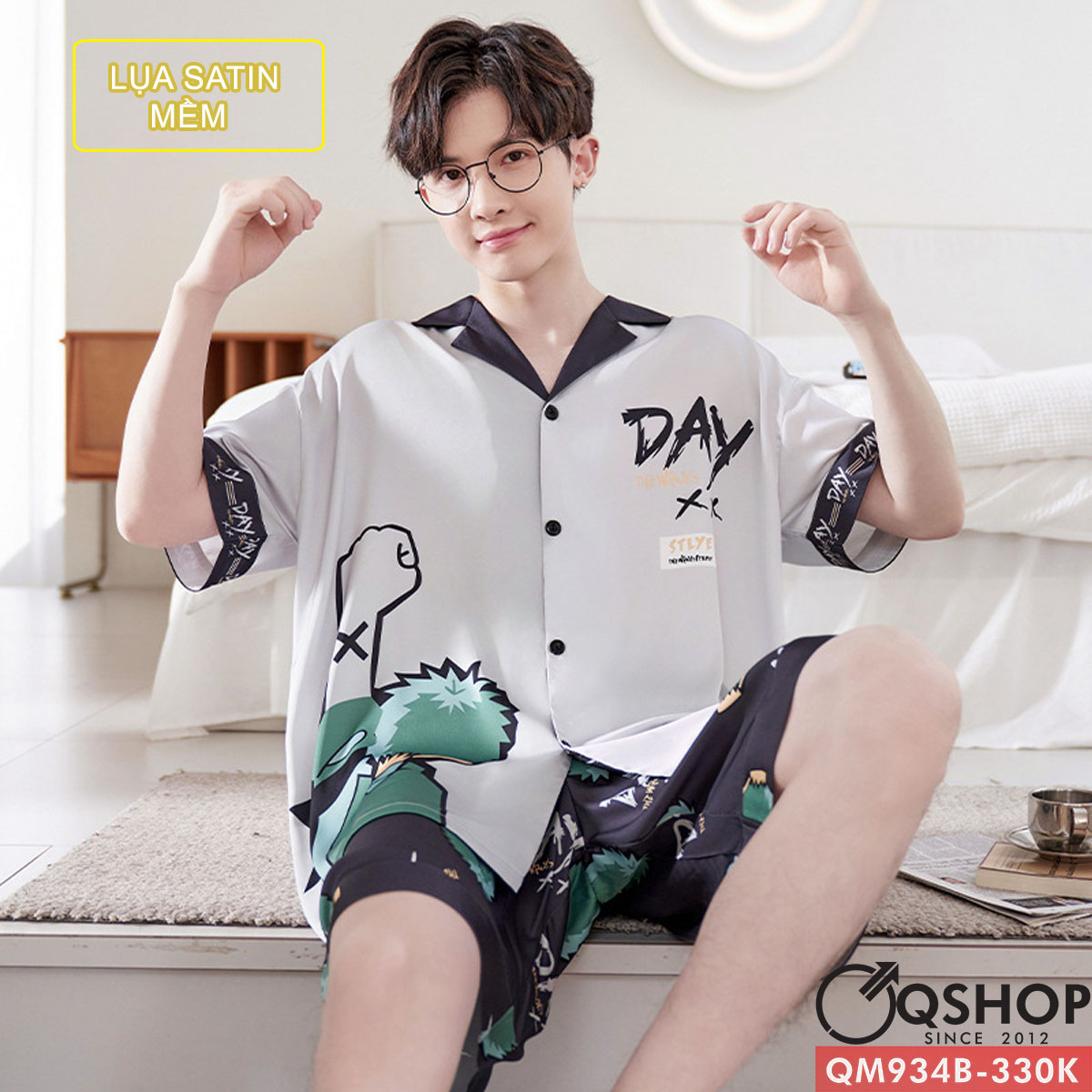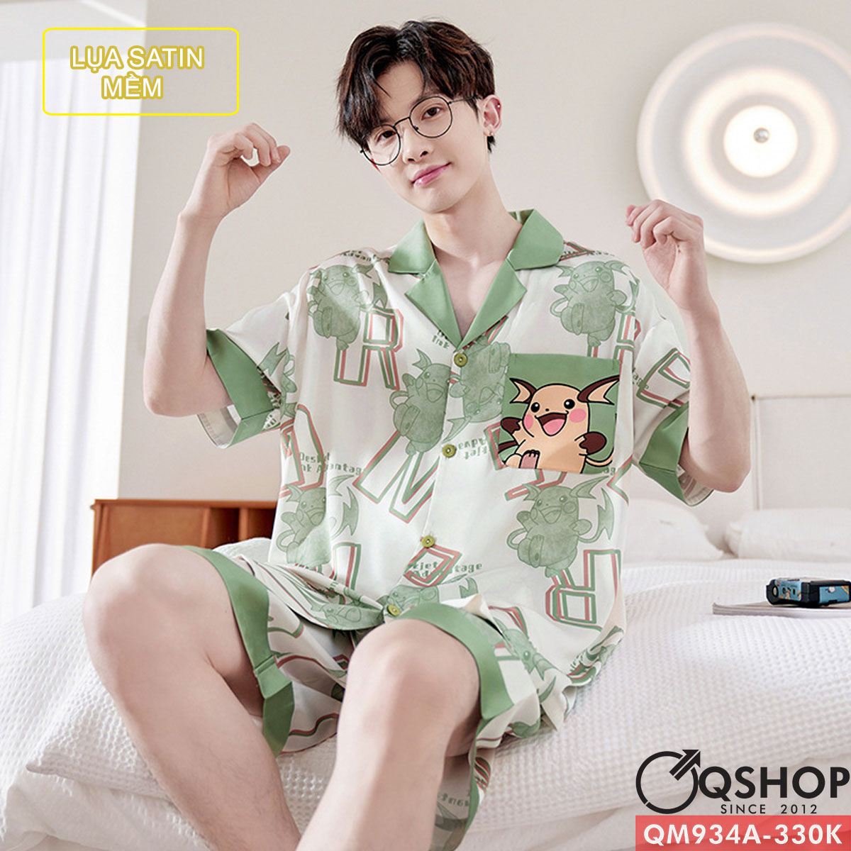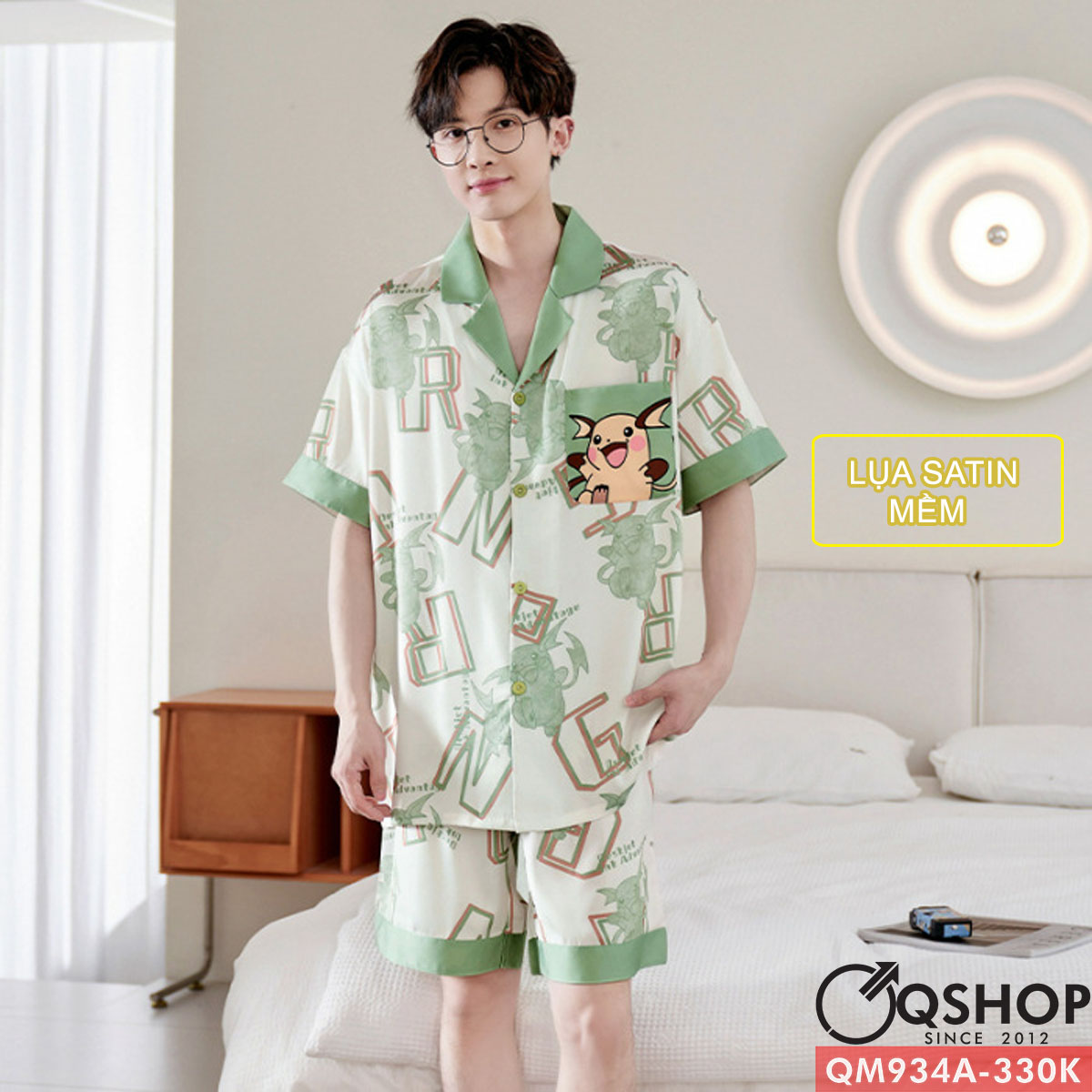 Bộ đồ ngủ nam quần ngắn tay ngắn lụa satin mềm họa tiết hoạt hình dễ thương QM934