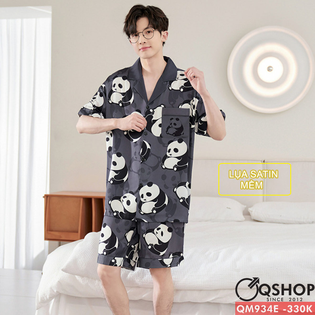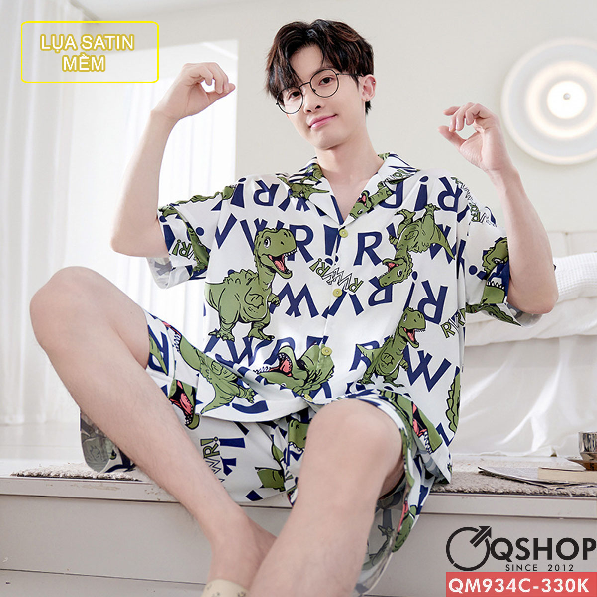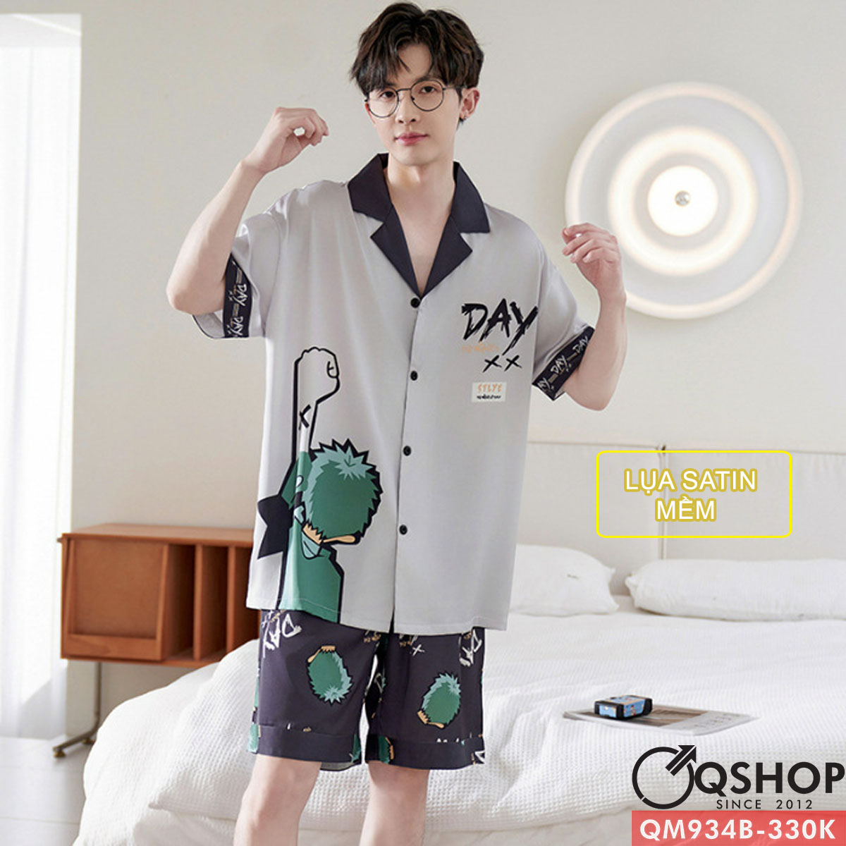 Bộ đồ ngủ nam quần ngắn tay ngắn lụa satin mềm họa tiết hoạt hình dễ thương QM934