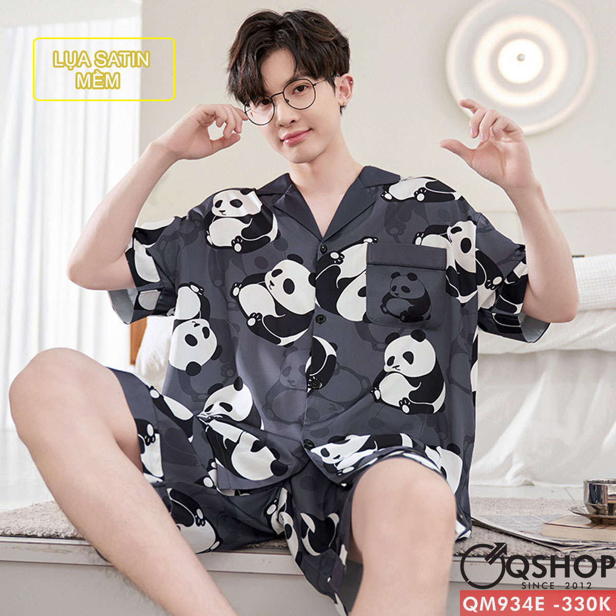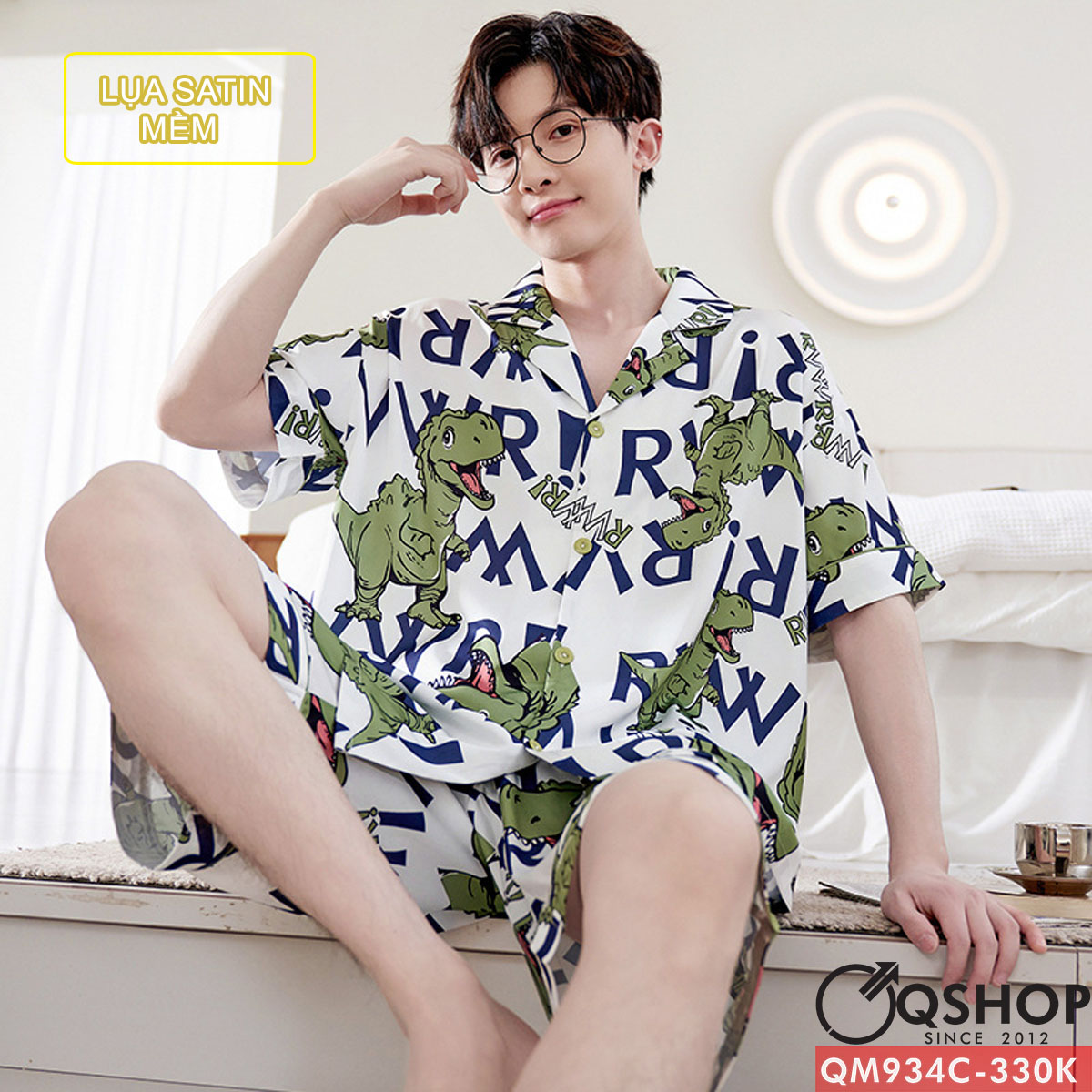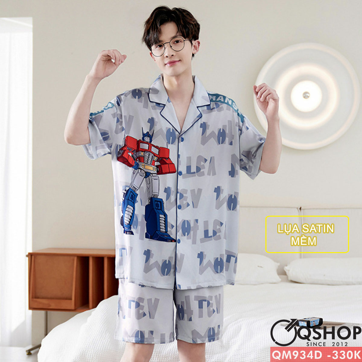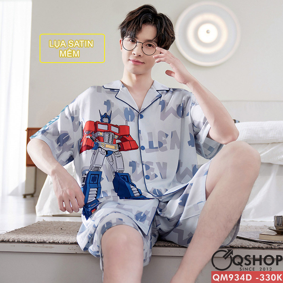 Bộ đồ ngủ nam quần ngắn tay ngắn lụa satin mềm họa tiết hoạt hình dễ thương QM934